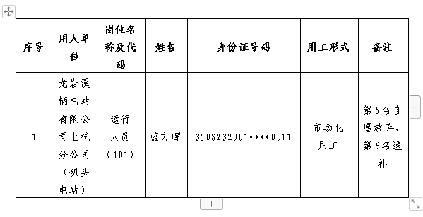 根据2024年12月12日发布的《关于龙岩市水利投资发展有限公司所属分公司公开招聘市场化用工工作人员的公告》有关要求,经报名、资格审查、组织考试、体检、考察、研究递补等程序,现将龙岩市水利投资发展有限公司所属上杭分公司(矶头电站)运行人员(岗位代码101)岗位递补拟录用人员名单公示如下: