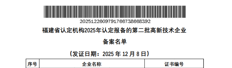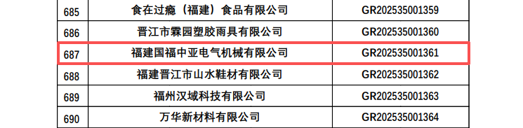 近日,全国高新技术企业认定管理工作领导小组办公室发布《对福建省认定机构2025年认定报备的第二批高新技术企业进行备案的公告》,国福中亚电气成功通过“高新技术企业”认定,(证书编号:GR202535001361)。